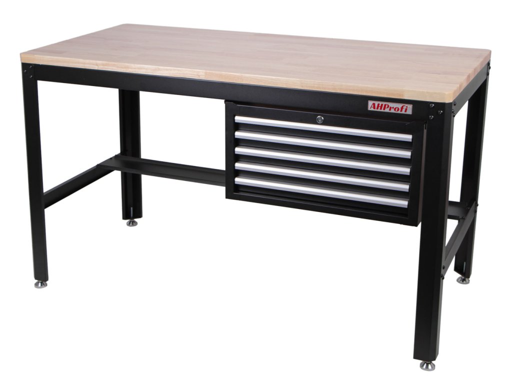 Ponk do dílny s dílenskou skříňkou na nářadí, 5 zásuvek. Pracovní deska z kaučukového dřeva, konstrukce ze za studena válcované oceli. Rozměry stolu 1562 x 762 x 920 mm, nosnost 200 kg.