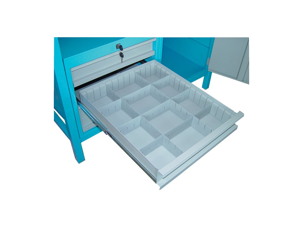 Vybavení: vrchní zásuvkový díl (-> 2 menší zásuvky, rozměry š x h x v: 430 x 520 x 85 mm, včetně univerzálně nastavitelných přihrádek: 3 podélné/3 příčné dělicí příčky).