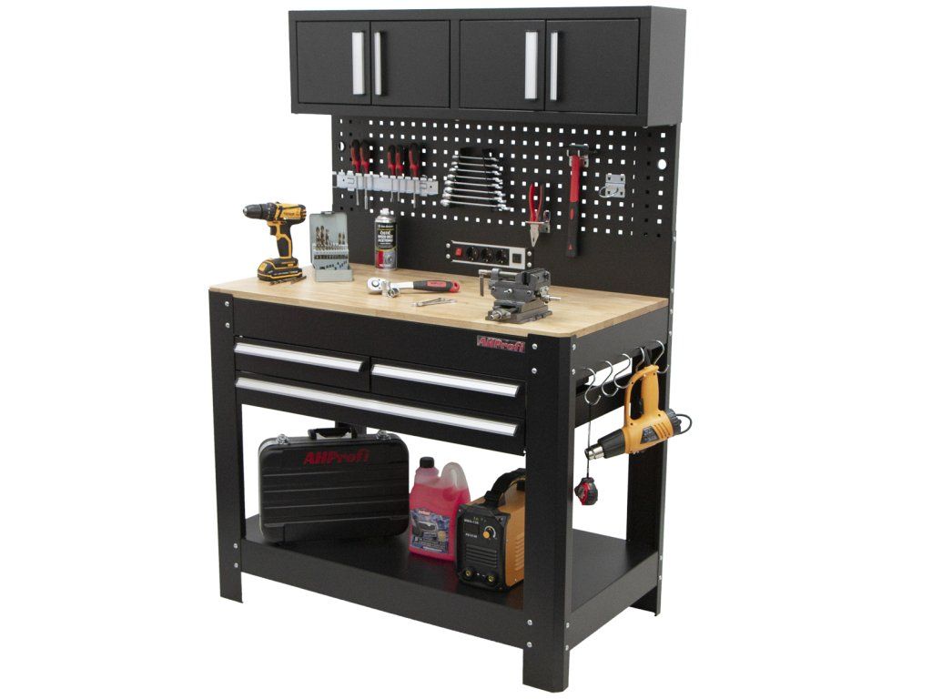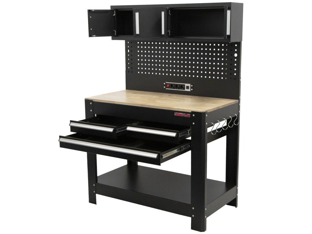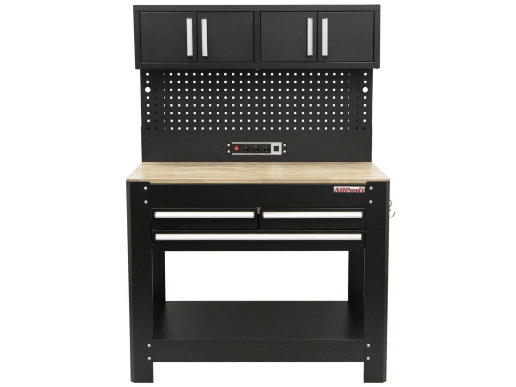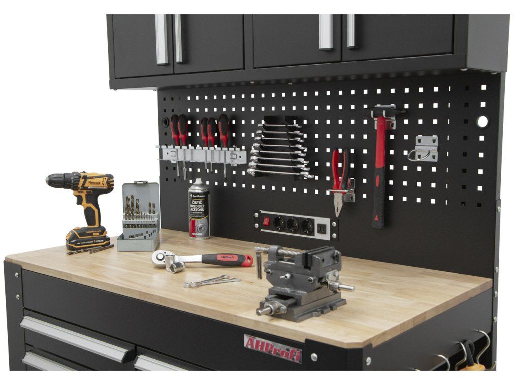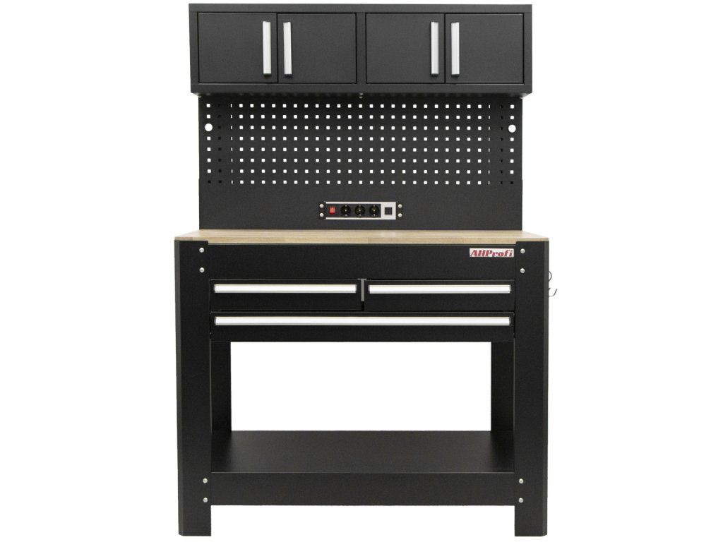 Pracovní stůl s děrovanou deskou, 3 zásuvkami a horními skříňkami - AHProfi