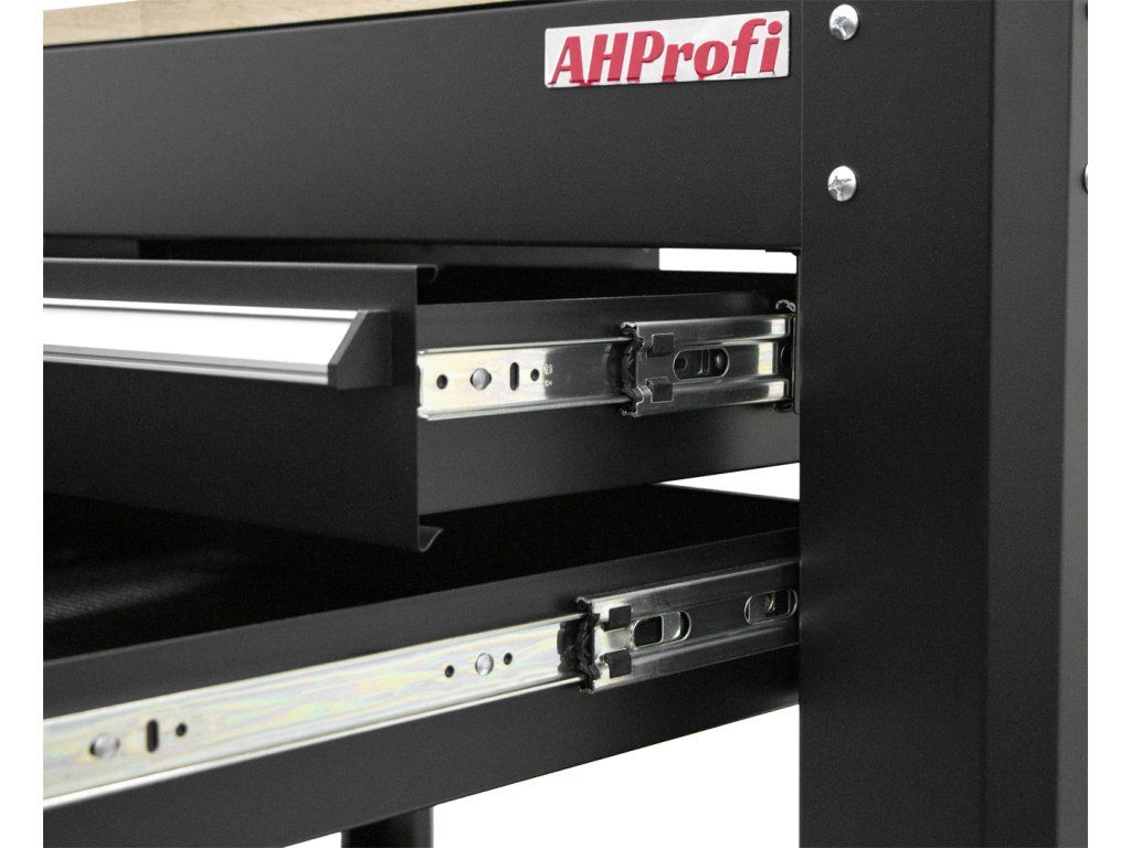 Zásuvky pracovního stolu jsou osazeny pojezdy s kuličkovými ložisky, díky kterým se snadno vysunují i při zatížení.