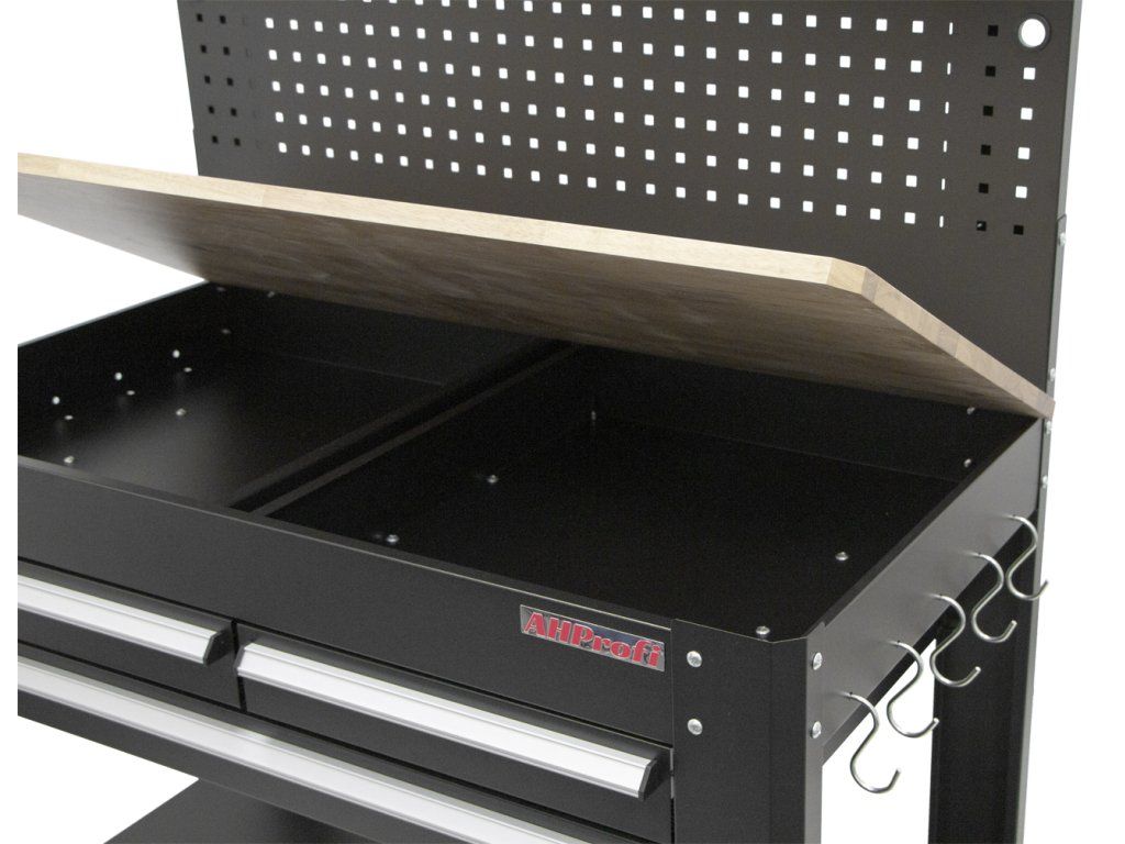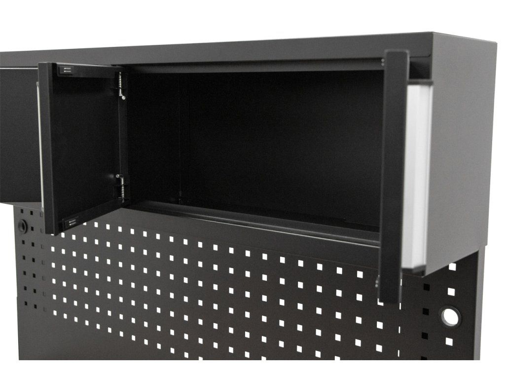 Mimo zásuvek je stůl opatřen děrovanou deskou (rozteč děr 38 x 38 mm) na kterou lze zavěsit široké množství háčků a držáků.