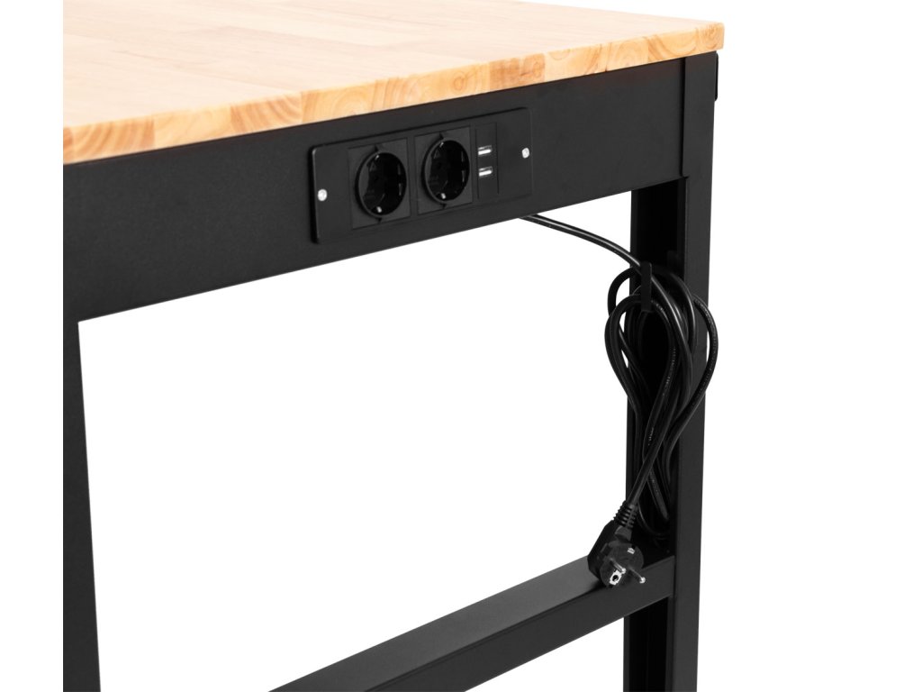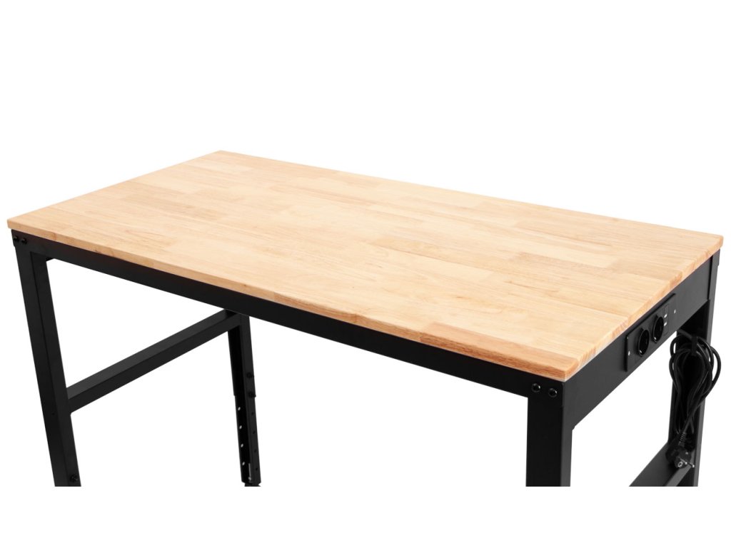Výškově nastavitelný dílenský stůl s dřevěnou pracovní deskou a zásuvkami na 230V