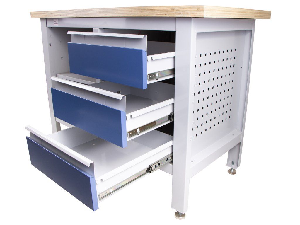 Profesionální kovový pracovní stůl se třemi zásuvkami a policí, pracovní deskou z masivního dřeva a speciální odolnou povrchovou úpravou.
