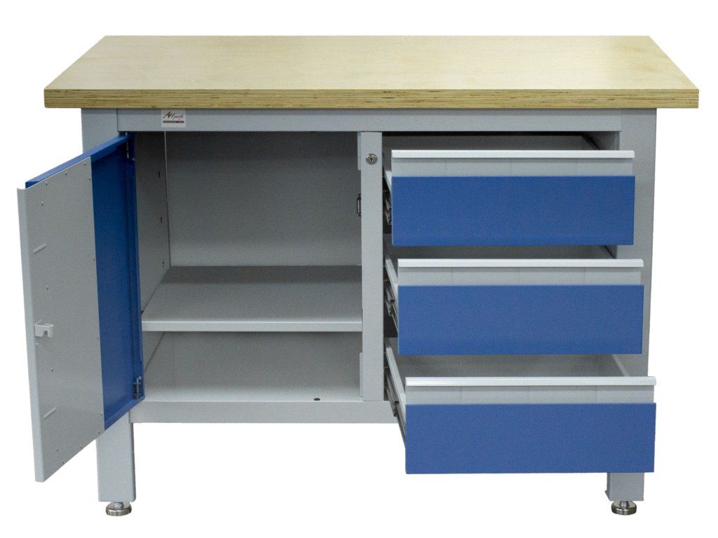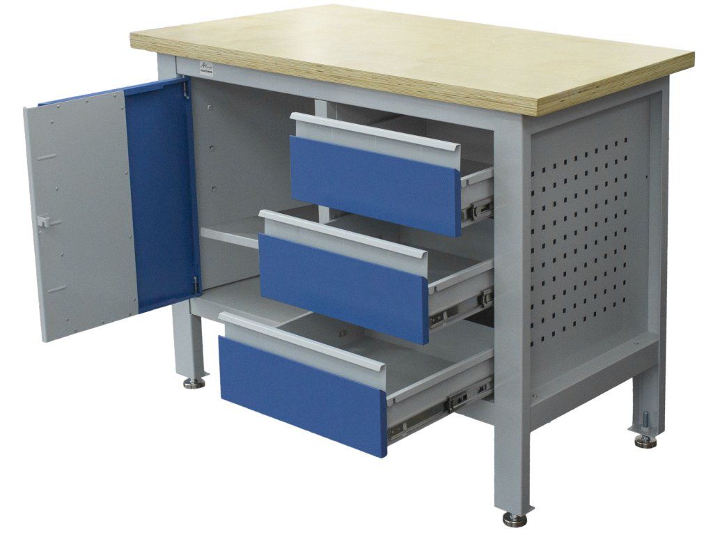 Profesionální kovový pracovní stůl se třemi zásuvkami a skříňkou, pracovní deskou z masivního dřeva a speciální odolnou povrchovou úpravou.