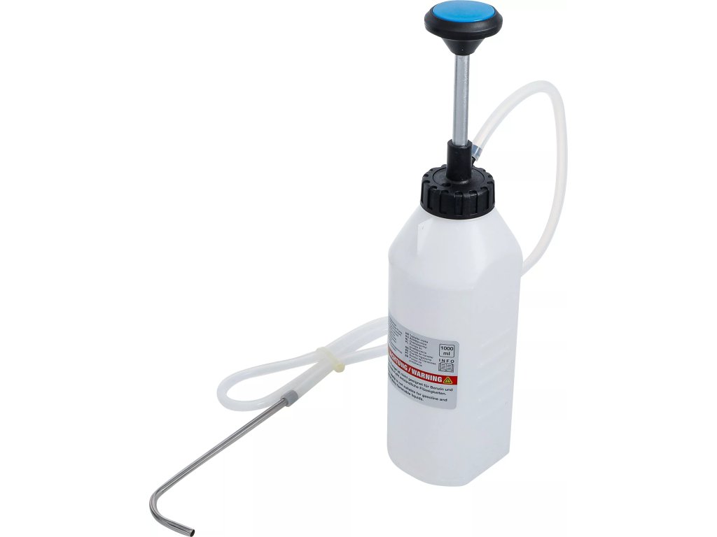 Ruční přečerpávací pumpa, objem 1000 ml., plastová nádoba, ruční pístové čerpadlo, průhledná hadice s kovovou trubicí. Celková délka 315 mm. Nevhodná pro benzín a hořlaviny.