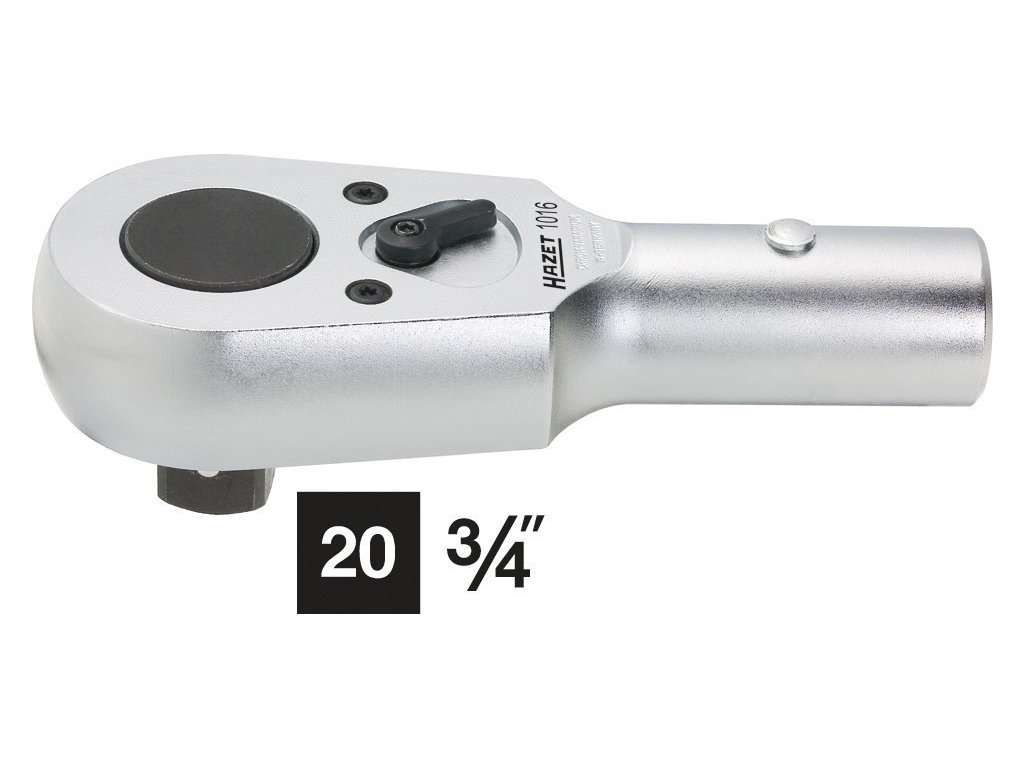 Přepínací ráčnová hlava, rozměr 3/4", německá kvalita HAZET, čtyřhran s kuličkou a kolíkovou pojistkou, 32 zubů, povrch: chromováno, DIN 3122, ISO 3315, vyrobeno v Německu.