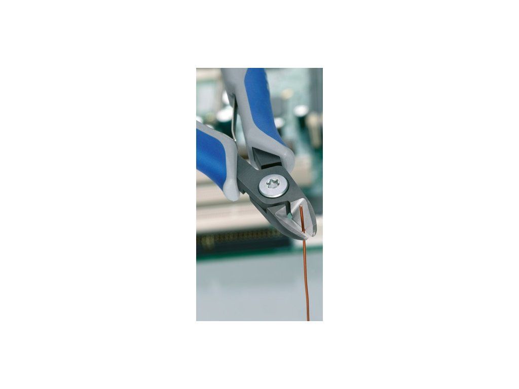 Precizní kleště pro nejjemnější stříhací práce např. v elektronice a jemné mechanice. Velmi přesně broušené, ostré břity s velmi malými fazetami na přesné řezy u citlivých elektronických součástek, rovněž bez fazet pro přesné odštípnutí. Břity doplňkově induktivně tvrzené, tvrdost břitů asi 64 HRC kováno. Hmotnost cca o 20 % nižší než u konvenčních kleští na elektroniku. šroubový kloub s precizně vyrobenými kloubními plochami pro rovnoměrný pohyb s malým třením v celém rozsahu rozevření.. Dvojitá pružina s malým odporem pro snadné a rovnoměrné rozevření.. Ergonomicky optimalizované vícesložkové návleky rukojetí. Kováno z chrom-vanadové oceli na kuličková ložiska. Kulatá hlava, s velmi malou fasetou. Kulatá hlava.