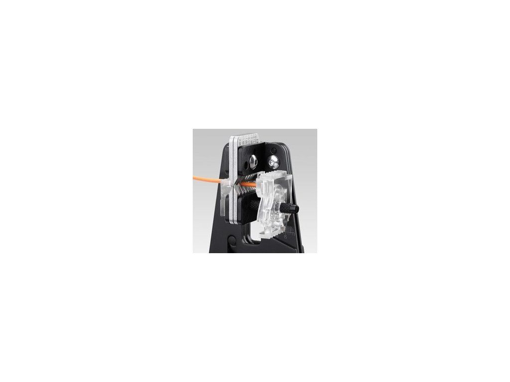 Tvarově přesné odizolování i obtížně odstranitelných izolačních materiálů vyrobených z PFTE, Silikon, Radox ®, Kapton ® a pryž, a to i vícevrstvých. Druhý pár nožů spolehlivě přidrží zbývající izolaci. Výměnné tvarové nože přesně uzpůsobené příslušnému průřezu kabelu. S nastavitelným délkovým dorazem pro stále stejné délky odizolování při sériové výrobě. Těleso kleští: ocel. Nůž: speciální nástrojová ocel, kalená v oleji. S doplňkovým vedením kabelů pro přesné polohování vodiče na místa, kde nůž odizolovává.