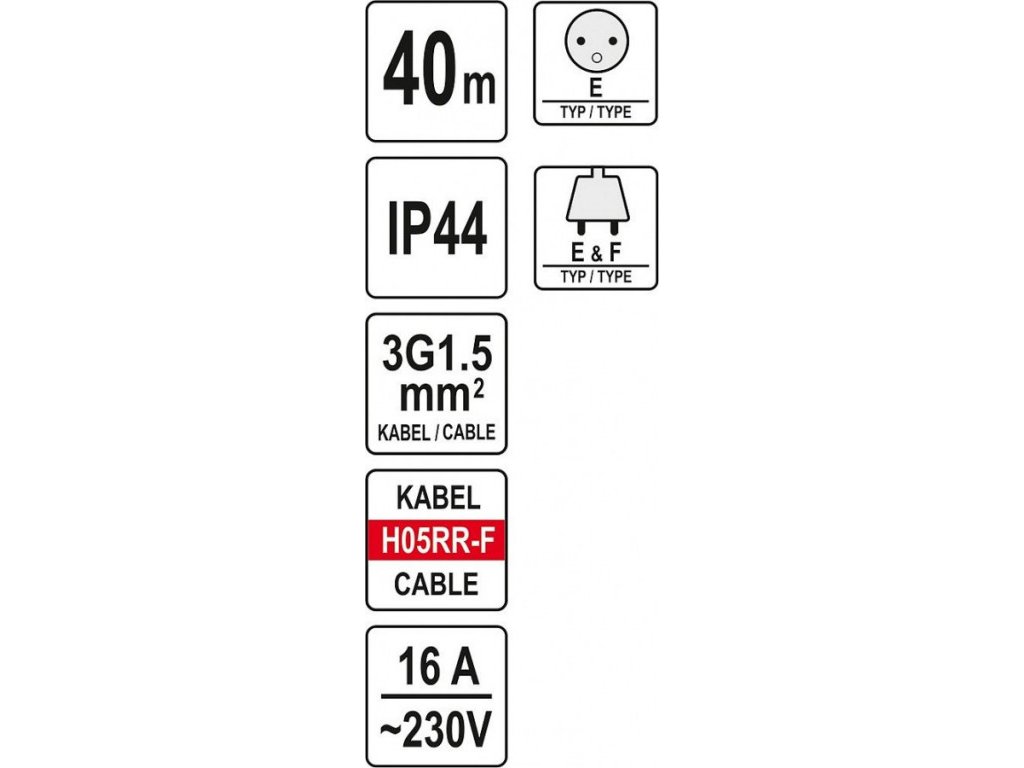 Prodlužovací kabel na bubnu o délce 40m se 4 zásuvkami. Kabel je vyroben z měděných drátů o průřezu 1,5mm2 Vodiče jsou pokryty izolací z přírodního kaučku H05RR-F Izolace poskytuje jmenovité napětí 300V / 500V Možné použití jak v interiéru tak i v exteriéru Prachotěsný - vynikající ochrana proti prachu nebo písku Odolný proti mechanickému poškození, chemikáliím, povětrnostním vlivům Vstupní napětí: 230V / 50Hz Stupeň ochrany: 44 IP Celková délka: 40m Typ izolace: RR-F Počet zásuvek: 4 Proud: 16A Barva: černá