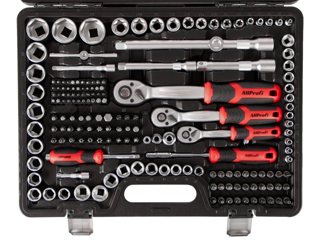- Komplexní obsah včetně ráčen, očkoplochých klíčů, nástrčných klíčů, bitů aj.