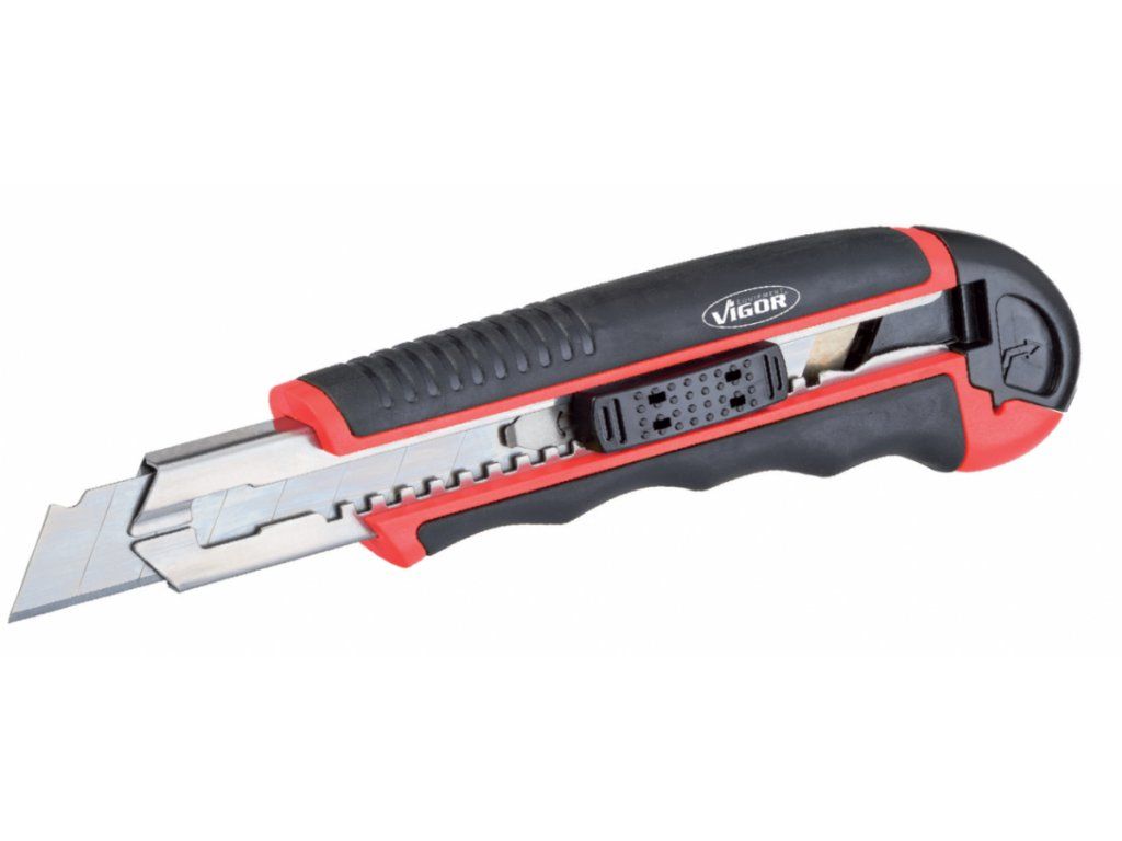 Univerzální nůž od značky VIGOR, s ocelovou fixací čepele, včetně 6 odlamovacích čepelí (8 dílků po 18 mm).