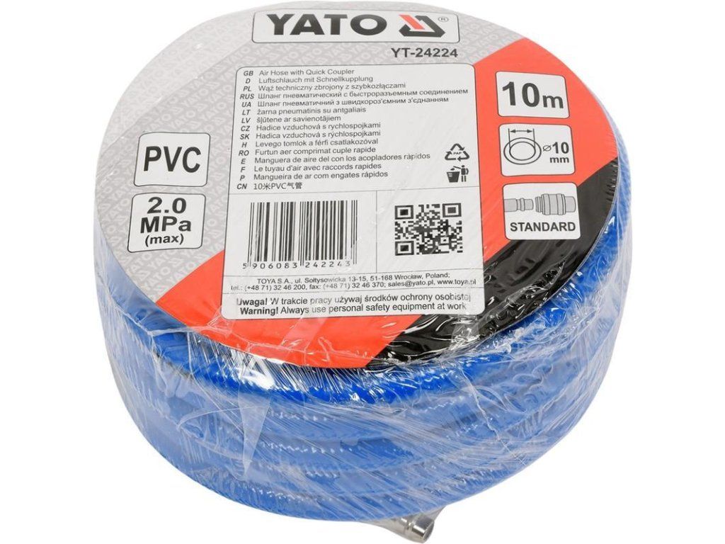 Profesionální hadice na stlačený vzduch o celkové délce 10 m, vnitřní průměr 10 mm, max. tlak 20 bar, zakončena rychlospojkami.