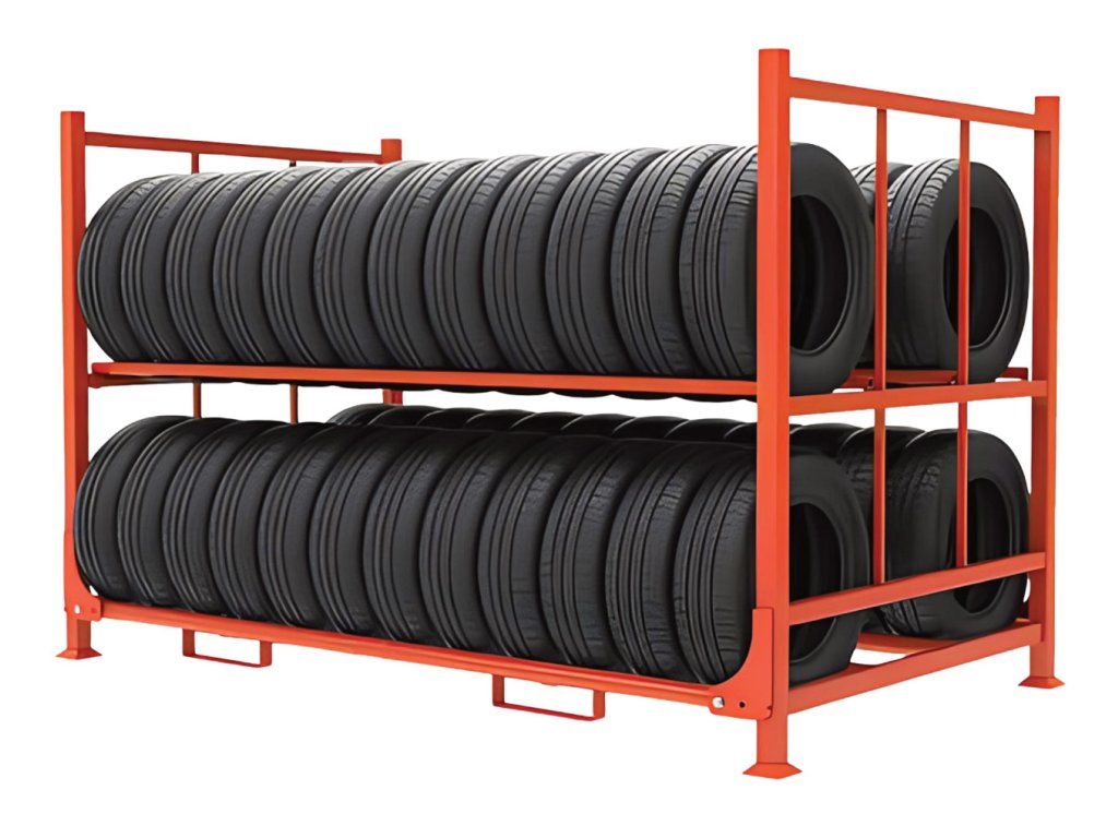 Robustní ocelový regál na skladování pneumatik osobních nebo dodávkových automobilů.