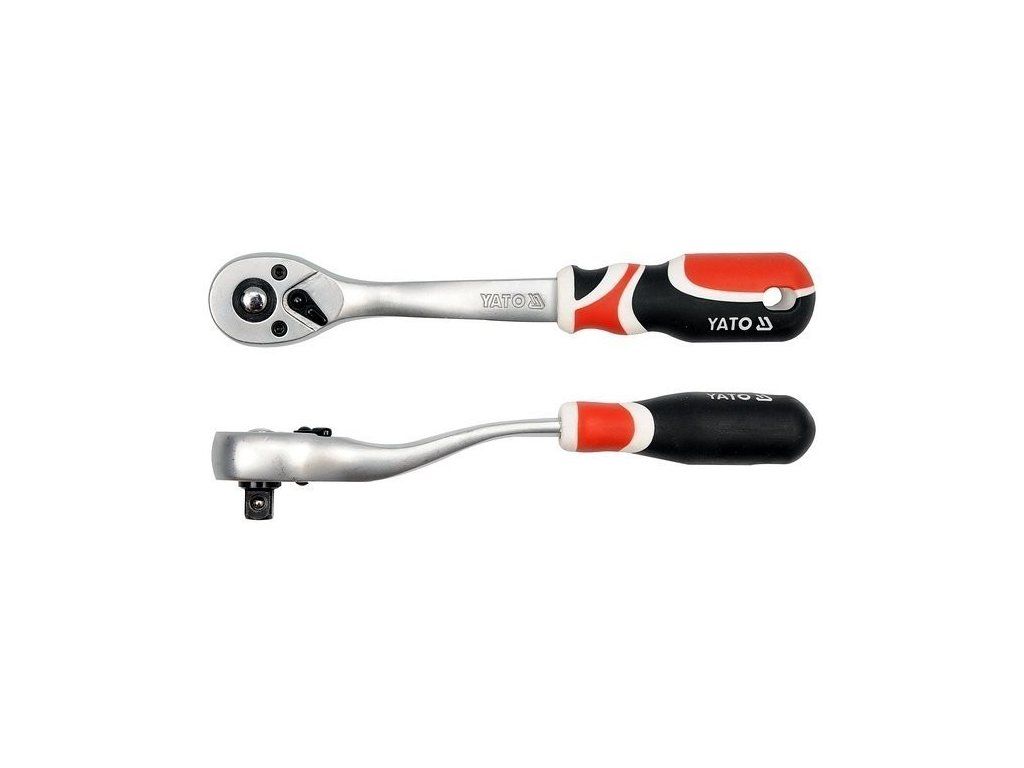 Přepínací vyhnutá ráčna YATO, rozměr 3/8", 72 zubů, vyrobena z CrV oceli s matnou chromovou povrchovou úpravou, délka 200 mm.