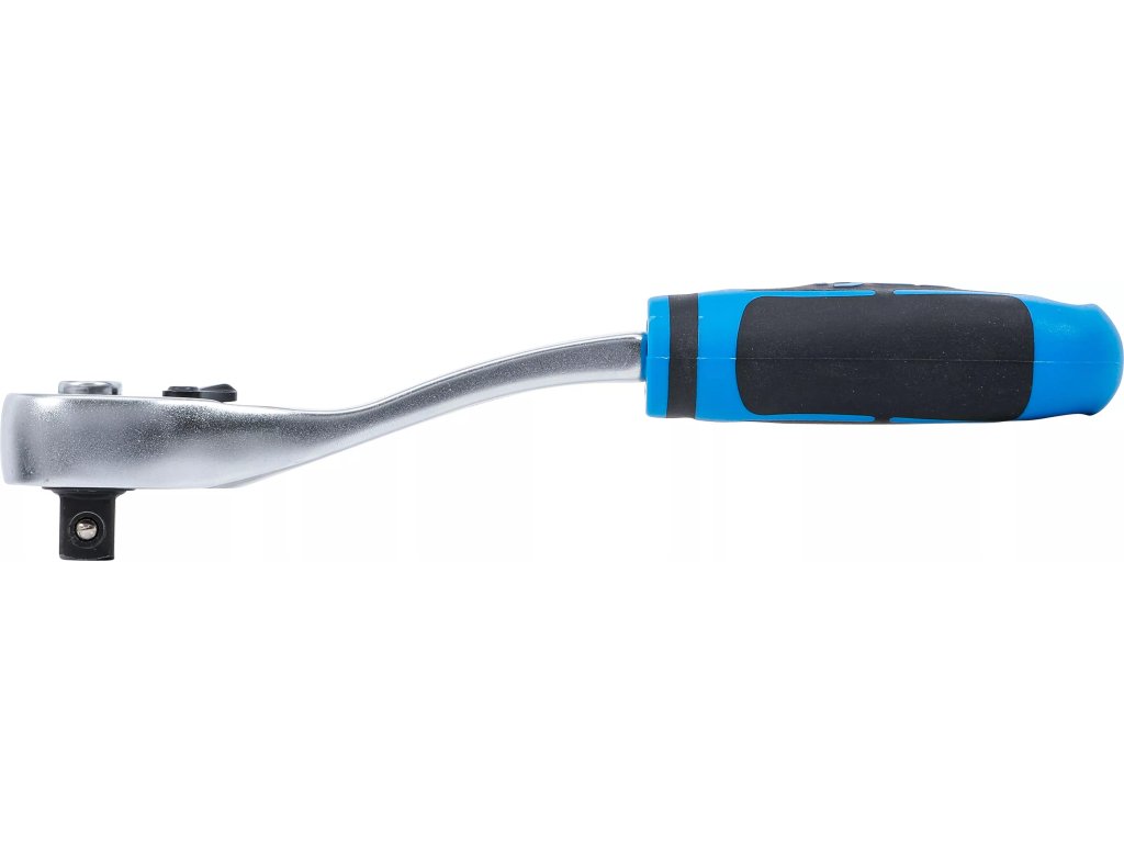 Přepínací ráčna, jemně ozubená, 1/2" (12,5 mm), délka 205 mm, 90 zubů v ráčně, zalomená hlava, ergonomická dvousložková rukojeť.