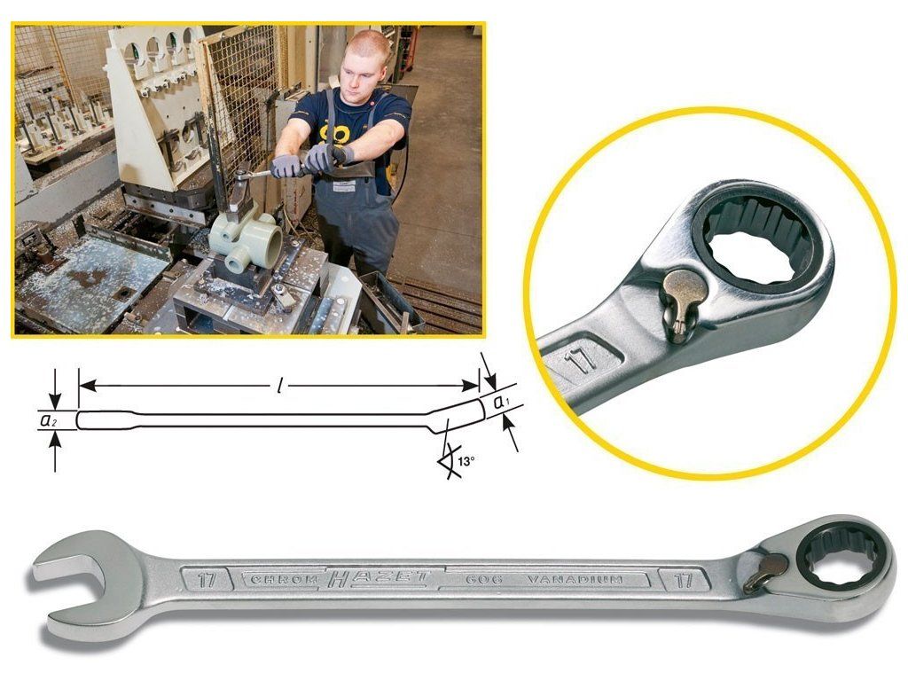 - Kvalitní ráčnový očkoplochý klíč od německého výrobce HAZET.