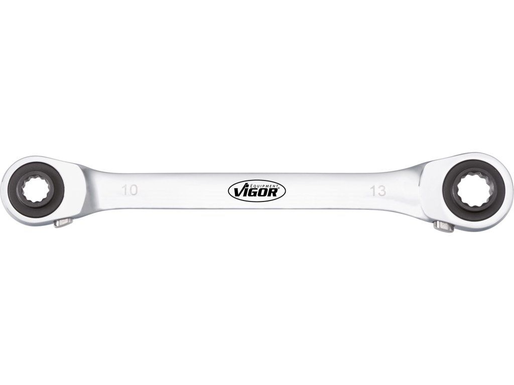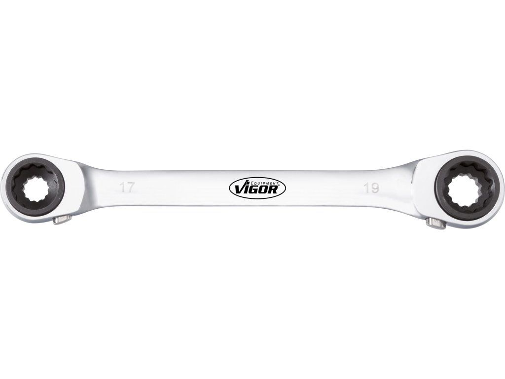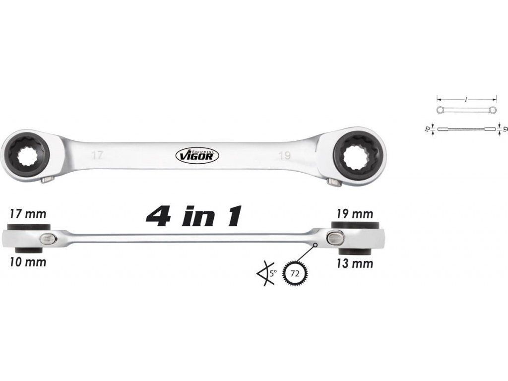 Očkový ráčnový klíč oboustranný 4 v 1, s velikostmi 10, 13, 17 a 19 mm a délce 220 mm. Obě ráčny jsou s přepínáním směru záběru.