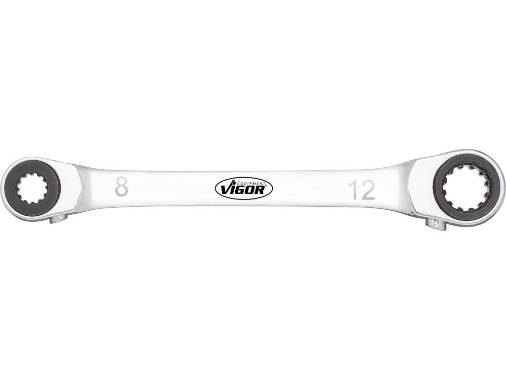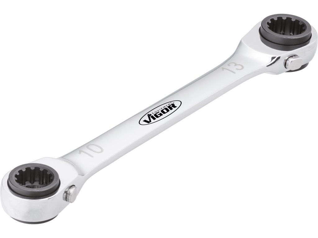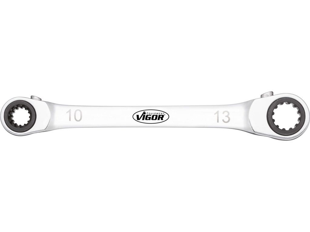 Oboustranný ráčnový klíč (4 v 1) má na jedné straně ráčnové klíče 8 mm a 10 mm a na straně druhé 12 mm a 13 mm.