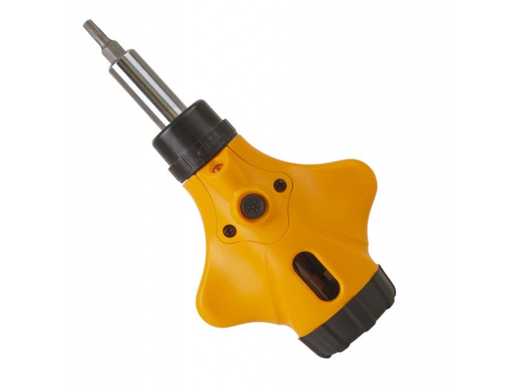 Sada obsahuje ráčnový šroubovák, který má ergonomickou rukojeť s "křidélky" a otvor pro uskladnění bitů a LED diodu pro pohodlnou práci i v šeru nebo po tmě.