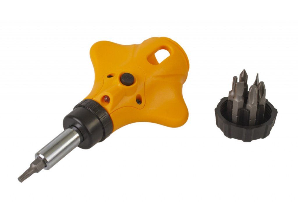 Sada ergonomického ráčnového šroubováku s bity 7 v 1. Obsahuje ploché, křížové a TORX bity.