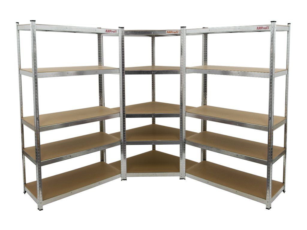 - 3dílná sestava: 2 rovné regály (1200 mm) + 1 rohový regál (900 mm)