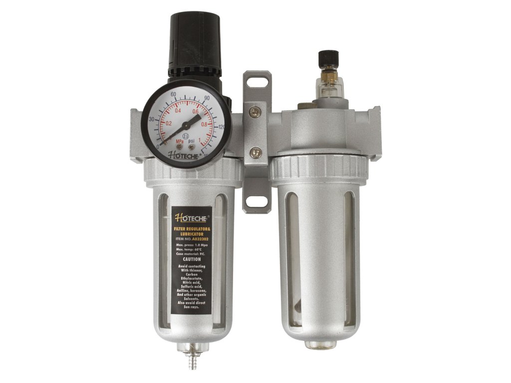 Regulátor tlaku vzduchu s odlučovačem vody a přimazáváním pro pneumatické nářadí.