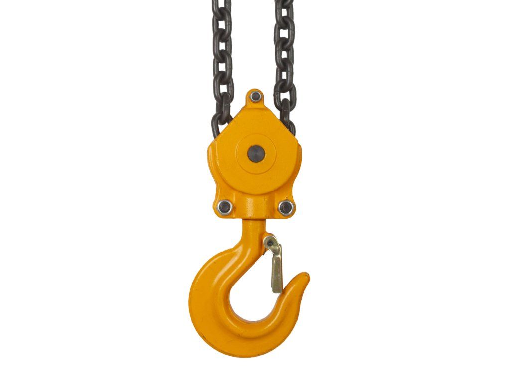 Robustní a pevná ocelová konstrukce se závěsným hákem s pojistkou, obslužným řetězem o průměru 4,8 mm a 3 m dlouhým pozinkovaným zdvihacím řetězem o průměru 10 mm z legované pozinkované oceli.