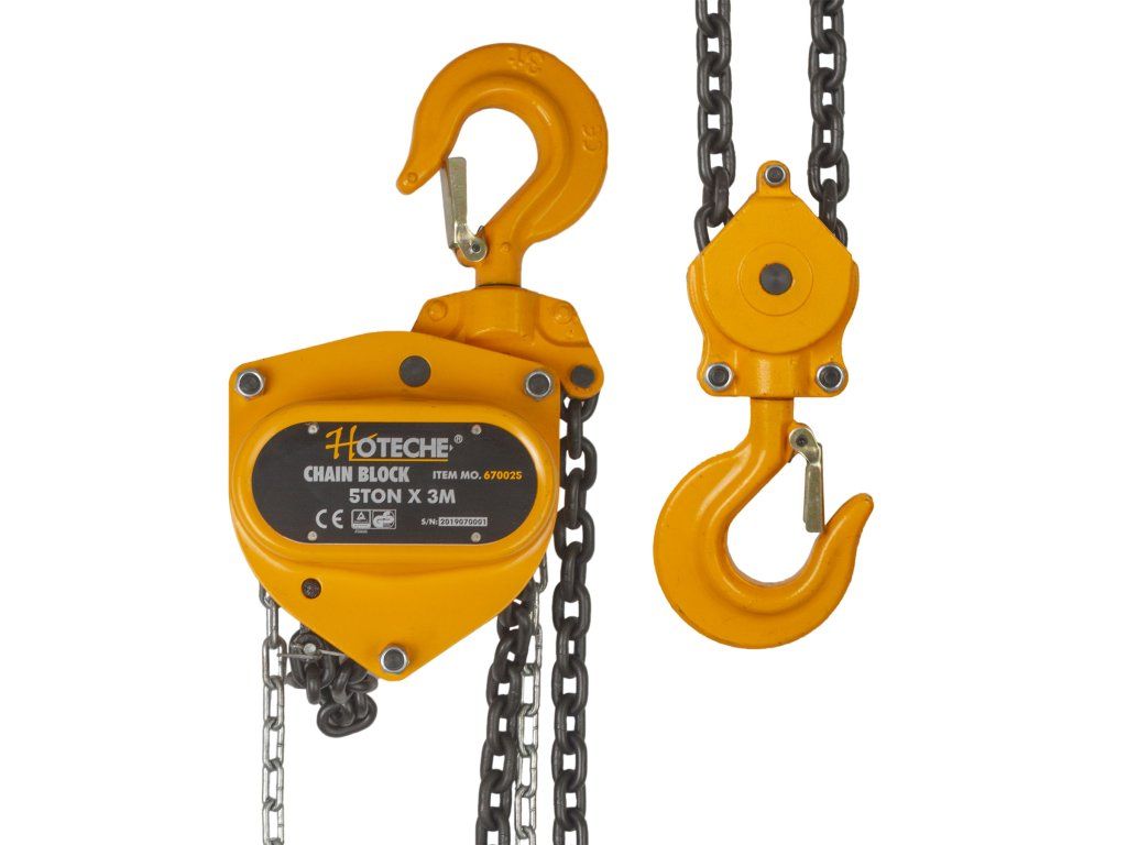 Přenosný řetězový kladkostroj (kočka) od značka Hoteche, určený pro svislé zvedání břemen do maximální váhy 5000 kg.