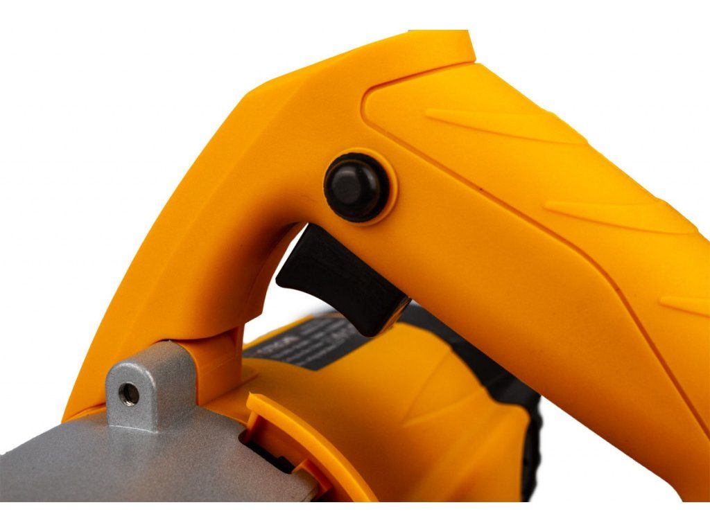 Základnu řezačky lze naklopit až do úhlu 45° pro přesné úhlové řezy. Rukojeť se spouští je osazena aretačním tlačítkem pro stálý chod.