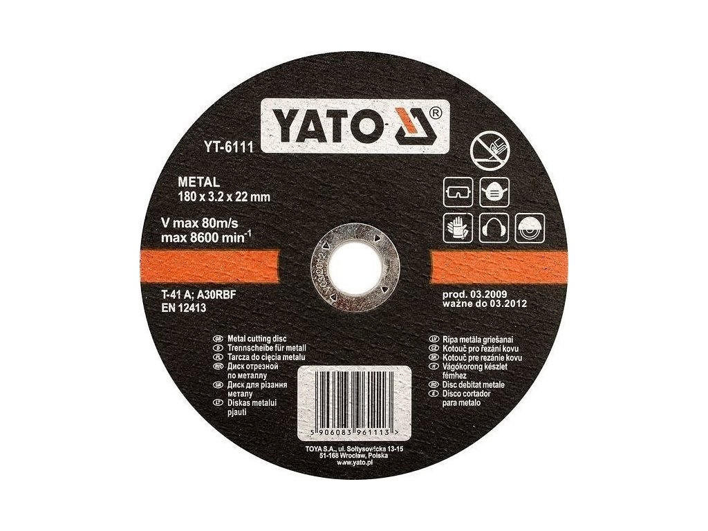 kotouč pro řezání kovu, plochý, ⌀ 115 mm, ⌀ otvoru 22 mm, 80m/s, max otáčky 13200, YT-5920