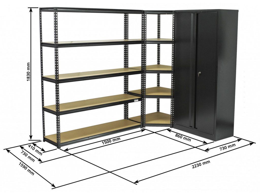 Regálový systém obsahuje klasický rovný regál o šířce 1500 mm , rohový regál o šířce 730 mm, který lze umístit na levou i na pravou stranu a uzamykatelnou dílenskou skříň o šířce 860 mm.