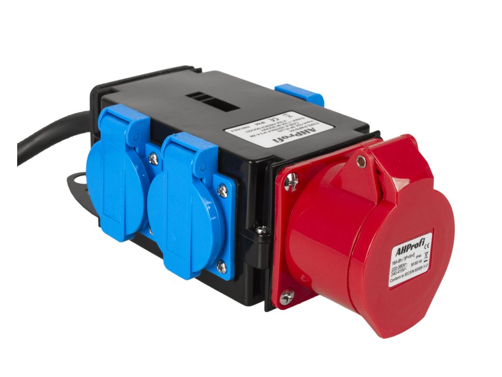 Rozbočovací zásuvka na 380/220 V s prodlužovacím kabelem o délce 2 m, stupeň krytí IP44.