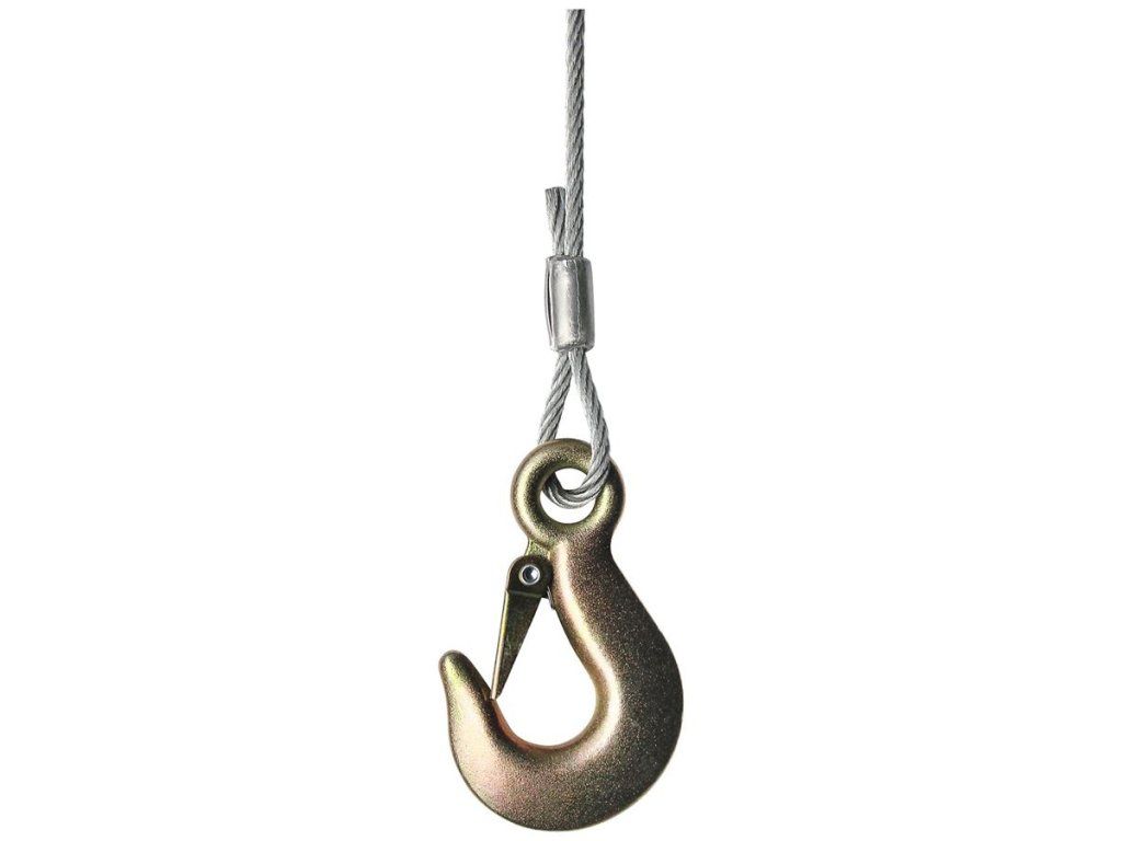 Konstrukce: ocelový korpus s otvory (3) pro montáž napevno, 10 m lano se závěsným hákem (→ bezpečnostní pojistka),