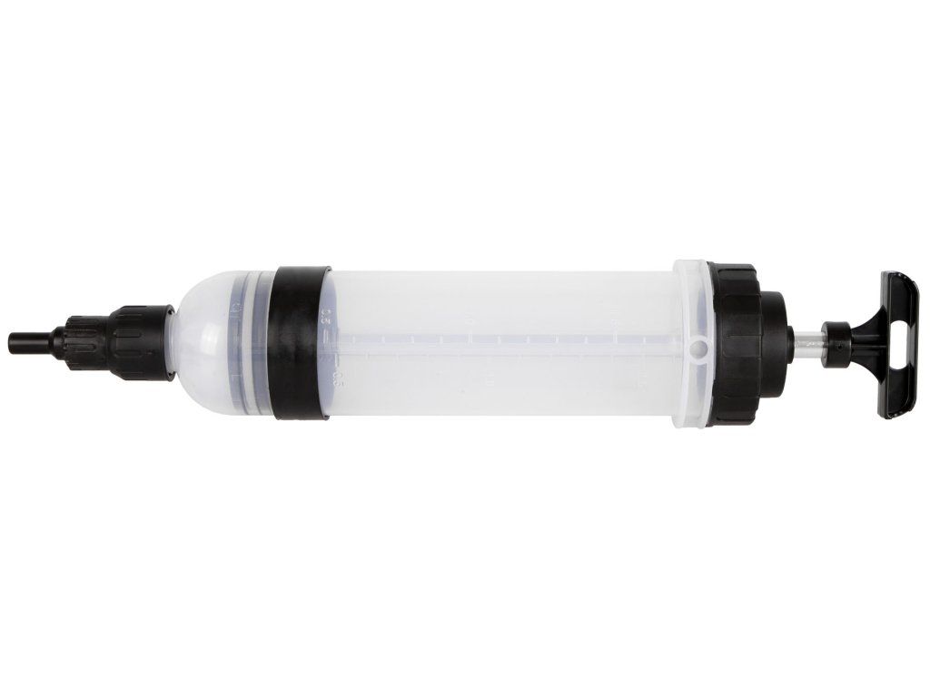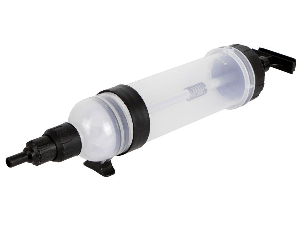 Ruční plnička a odsávačka provozních kapalin typu injekční stříkačka s obsahem zásobníku 1,5 l.