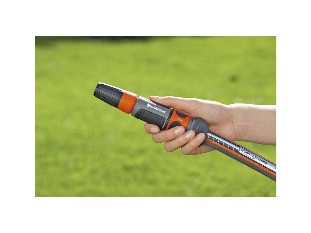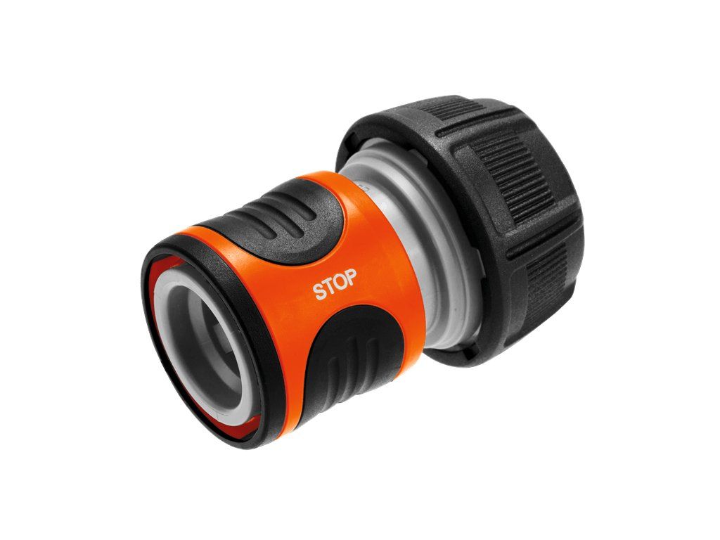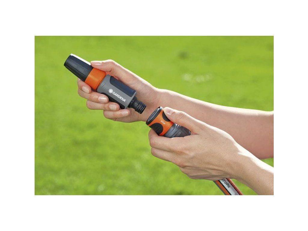 GARDENA rychlospojka se připojuje na konec hadice. Po odpojení připojeného zavlažovacího přístroje, např. postřikovače nebo zavlažovače, se voda automaticky zastaví; po připojení přístroje začne zase volně proudit.