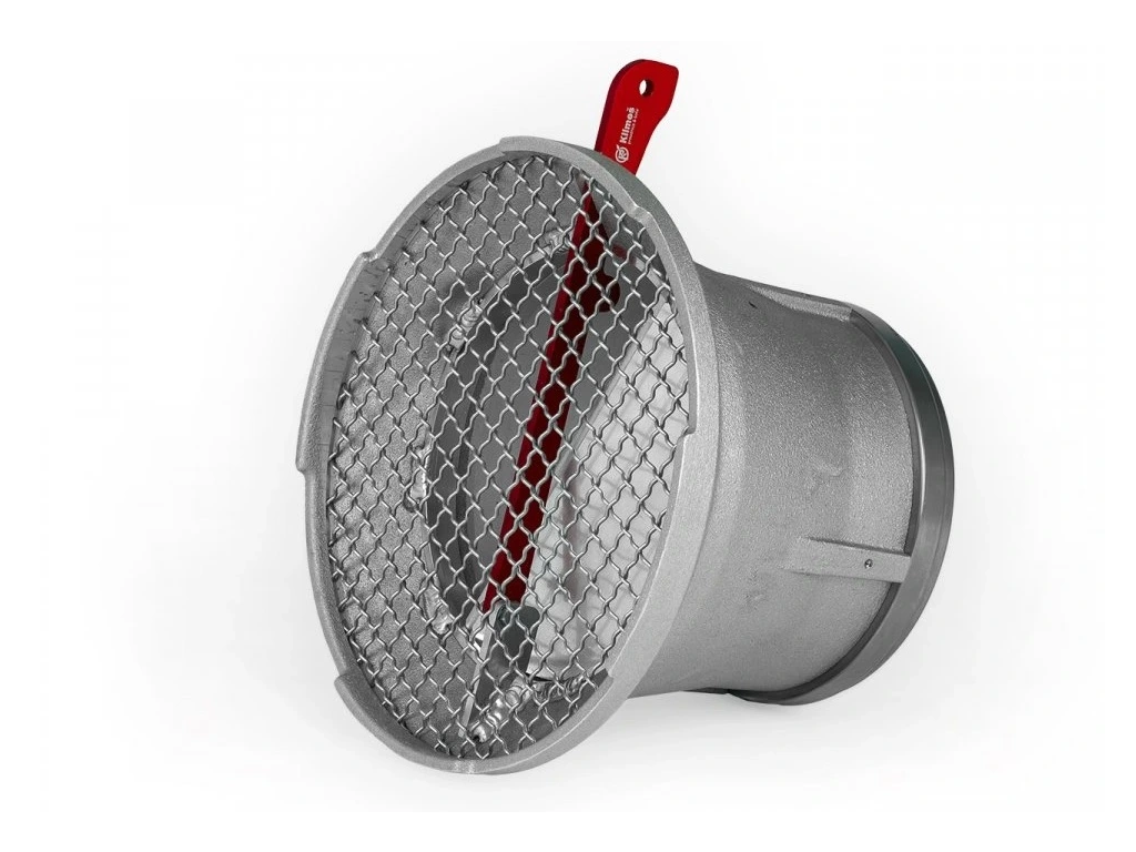 Trychtýř s vnějším průměrem 220 mm a nerezovým sítem 10 x 10 nebo 5 x 5 mm a eloxovanou páčkou v červené, modré nebo černé barvě.