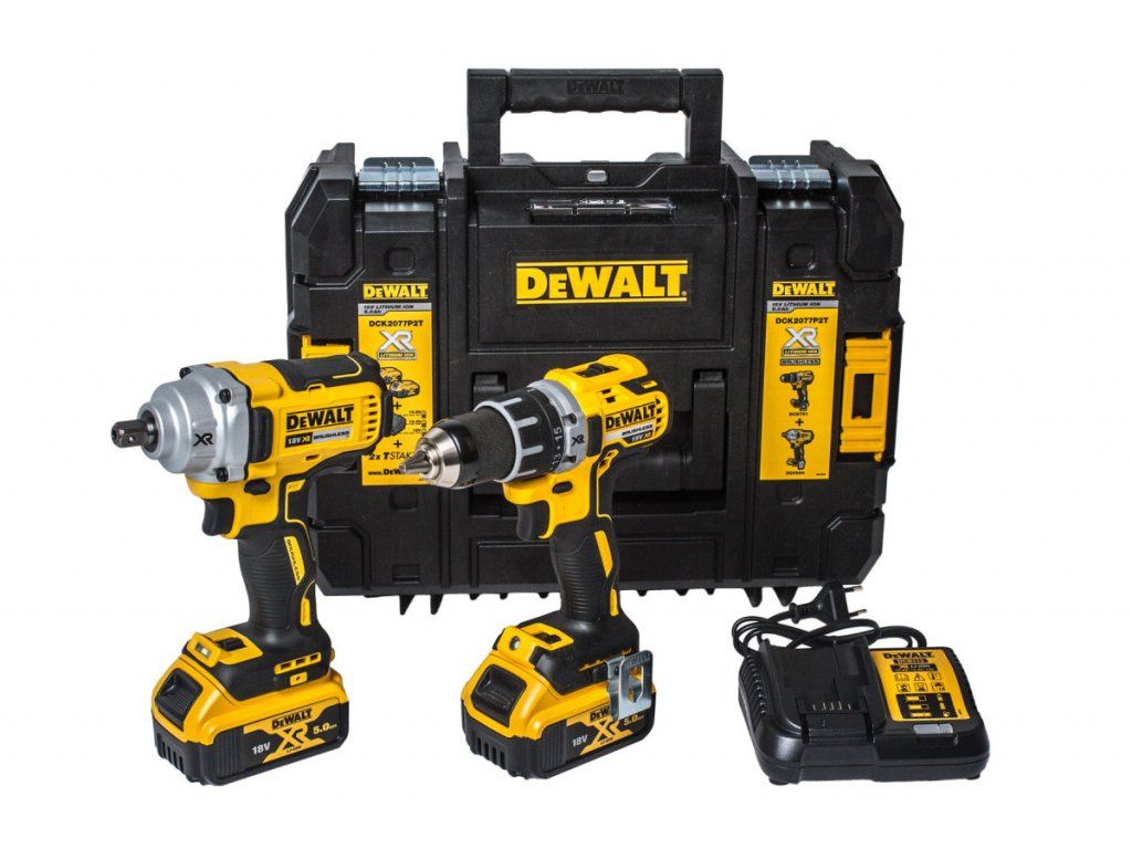 Sada obsahující Aku vrtačku s Aku rázovým utahovákem. Dále 2x akumulátor 18 V 5,0 Ah. Nabíječka a 2x Kufr.