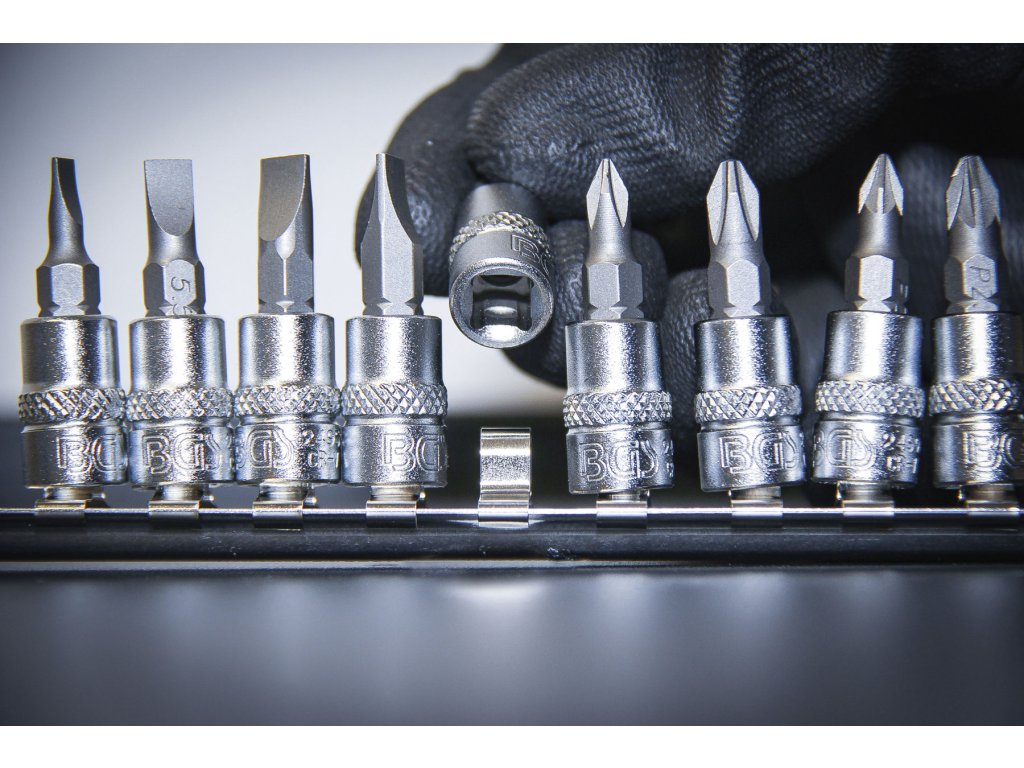 Čtyřhran 1/4", ploché 4; 5,5; 6,5 a 7 mm, křížové PH0, PH1, PH2, PH3, PZ0, PZ1, PZ2 a PZ3.