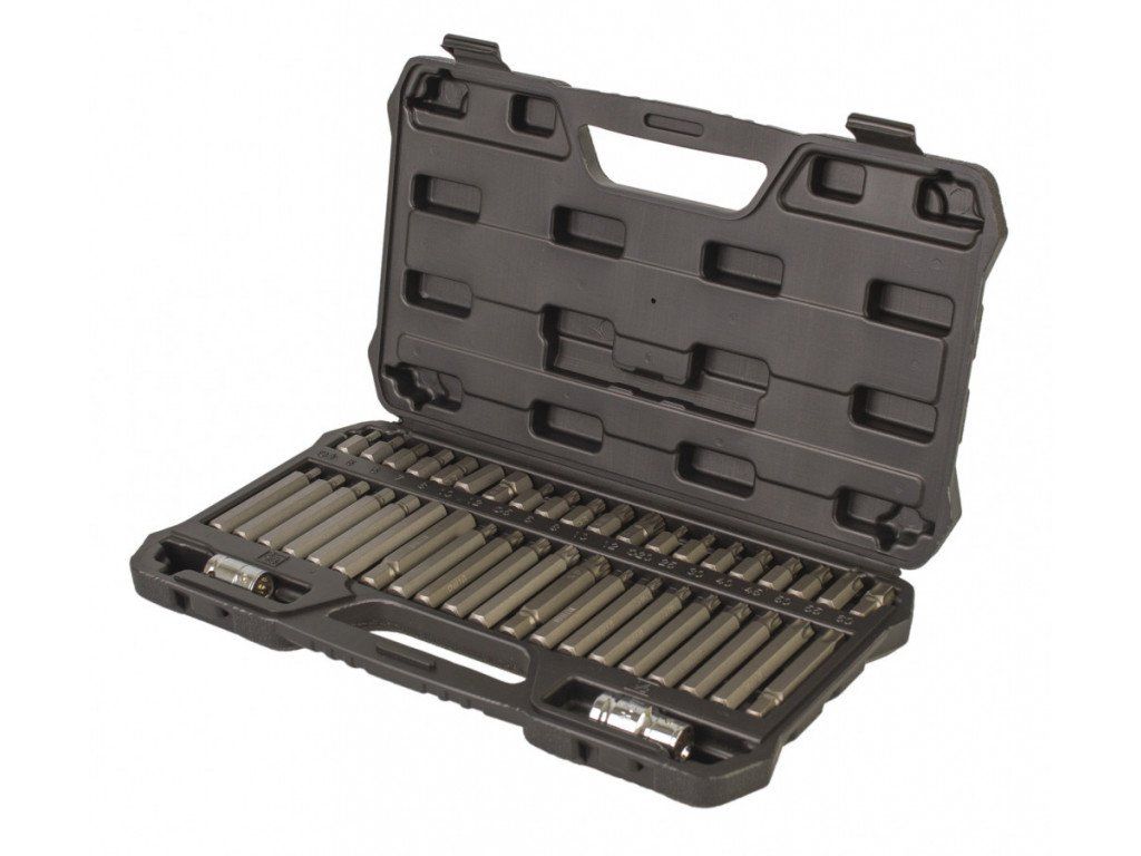 Kompletní sada 42 nejpoužívanějších bitů s profily H (Imbus) - šestihran, M (XZN, SPLINE) - tisícihran a T (Torx) - hvězdička. Sada samozřejmě obsahuje chromové adaptéry k připojení bitů na řáčny 1/2" a 3/8".