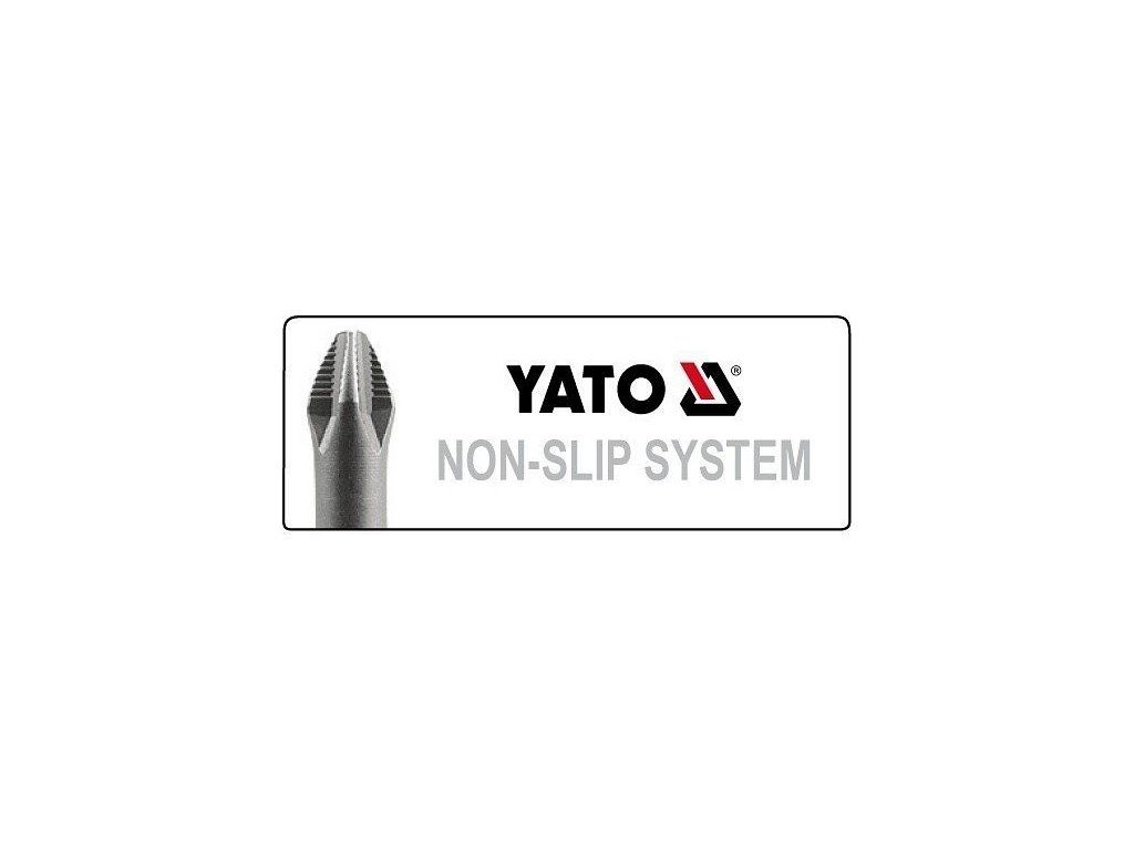 Kvalitní bity Yato se systémem Non-Slip, kdy je hrot bitu vybaven žebrováním zabraňujícím sklouznutí šroubu a zvyšujícím přenos kroutícího momentu.