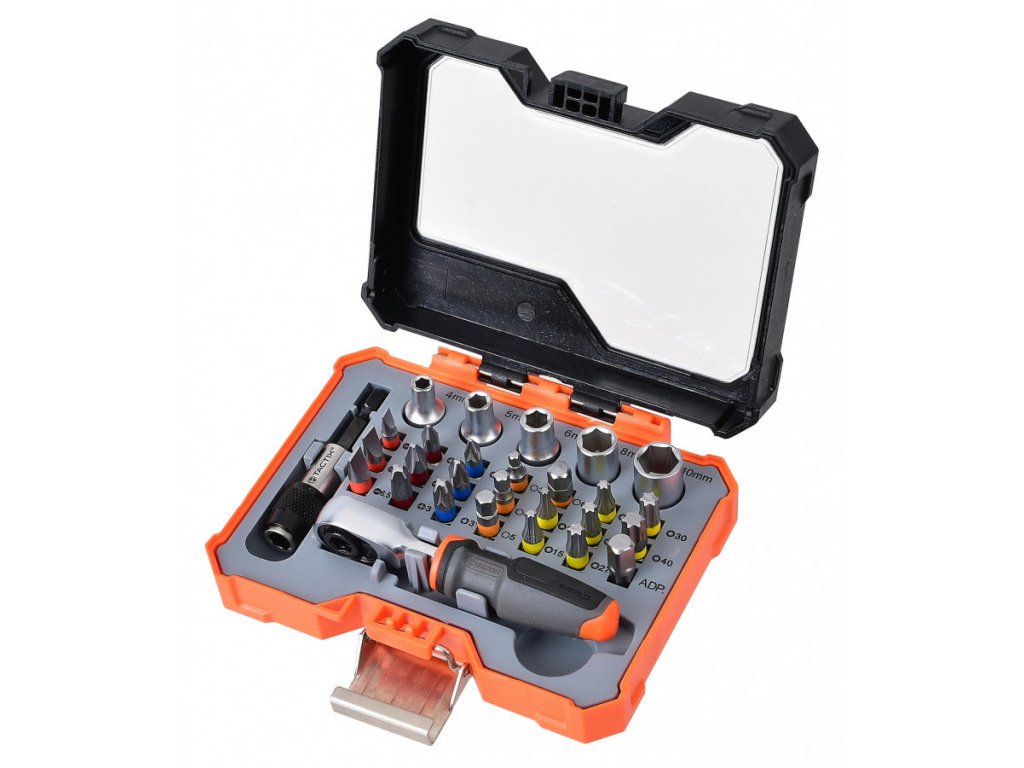 Sada bitů s mini ráčnou, prodlužovacím nástavcem a nástrčnými klíči. Plastový box. 28 ks.