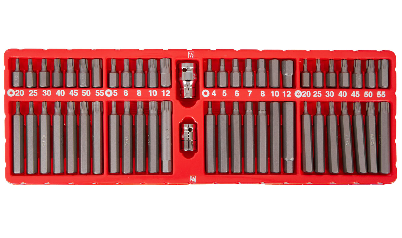 54 ks bitů v kovovém pouzdře, Imbus, Torx, XZN (tisícihran), a Torx s dírou.
