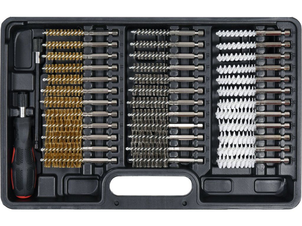 Nerezové, nylonové a mosazné kartáče o průměru 8 až 19 mm. V plastovém kufříku.