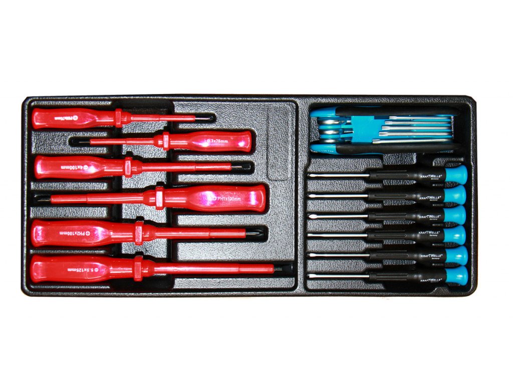Elektrikářské a hodinářské šroubováky ve vložce do dílenského vozíku, 13 ks.