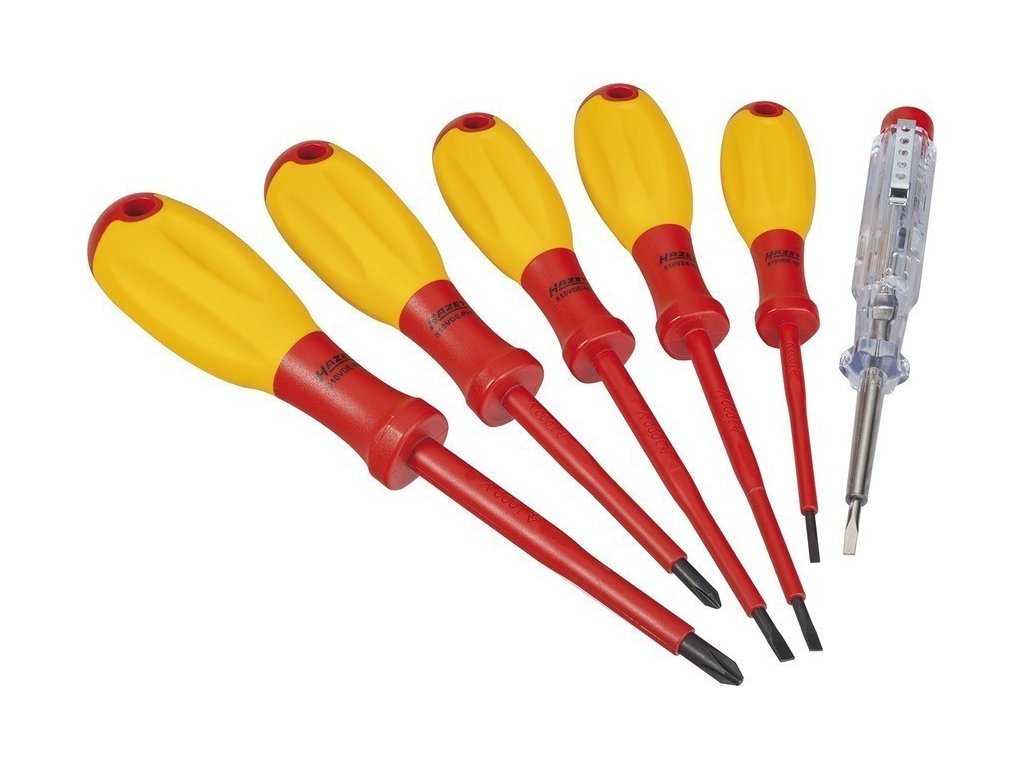 Sada kvalitních šroubováků VDE HAZET, izolované elektrikářské šroubováky, 6 kusů, 3 ploché, 2 křížové a zkoušečka.