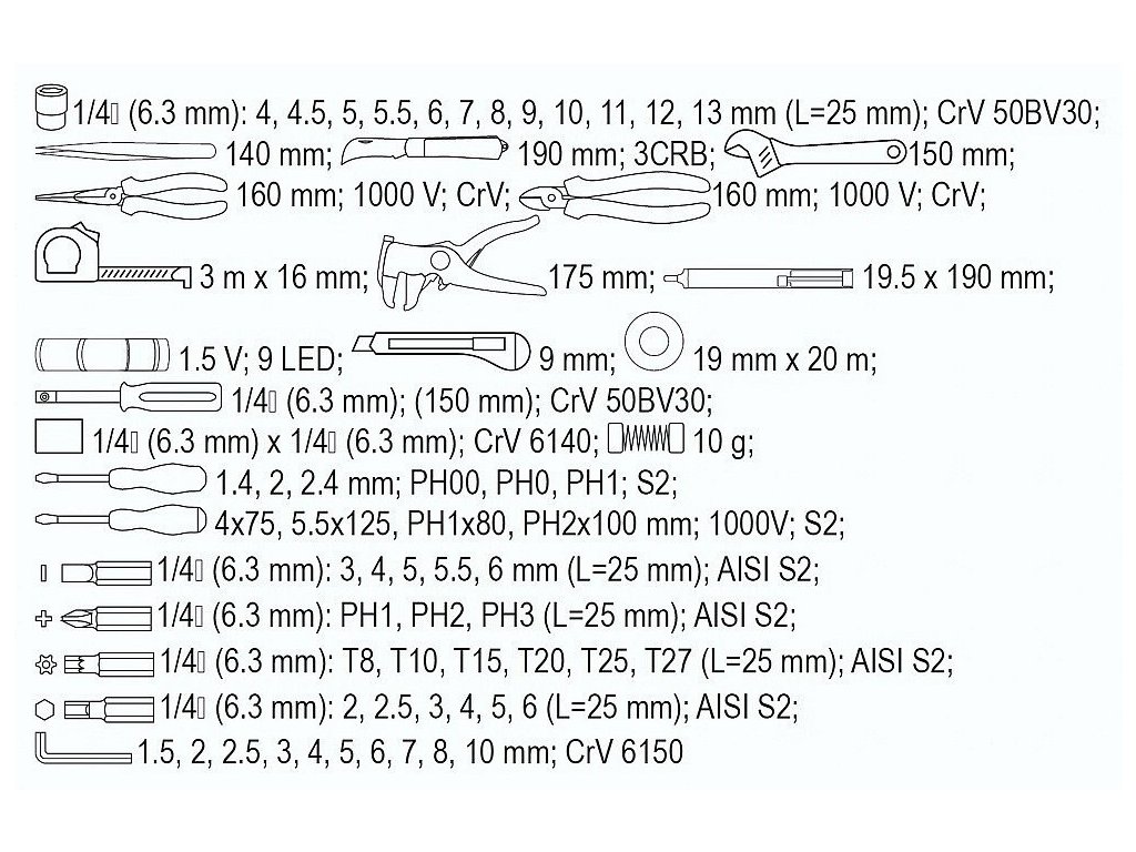 - Izolovaný šroubovák: 4x75, 5.5x125, PH1x80, PH2x100mm (1000V)