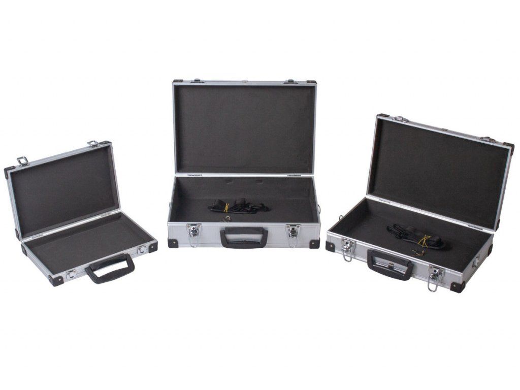 Sada tří hliníkových kufrů, které lze uskladnit do sebe. Kufry jsou lehce přenosné díky madlům. Ke dvou větším kufrům lze připnout popruh na ramena.