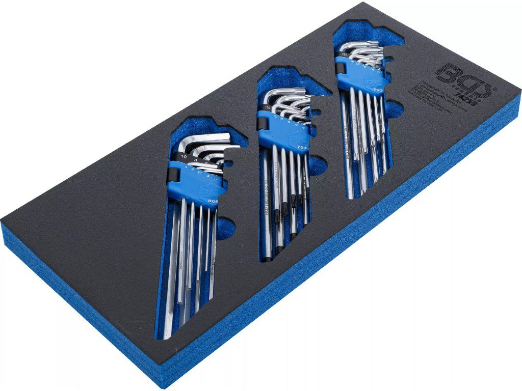 Pěnová vložka o rozměrech (š x h x v) 189 x 408 x 32 mm obsahuje celkem 27 ks kvalitních Imbus a Torx klíčů.