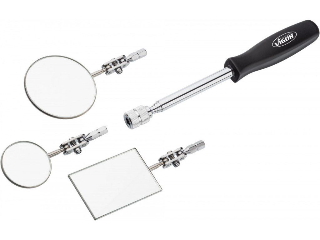 Sada inspekčních zrcátek obsahující teleskopický nástavec na zrcátka, 2x kulaté zrcátko a 1x obdélníkové zrcátko.
