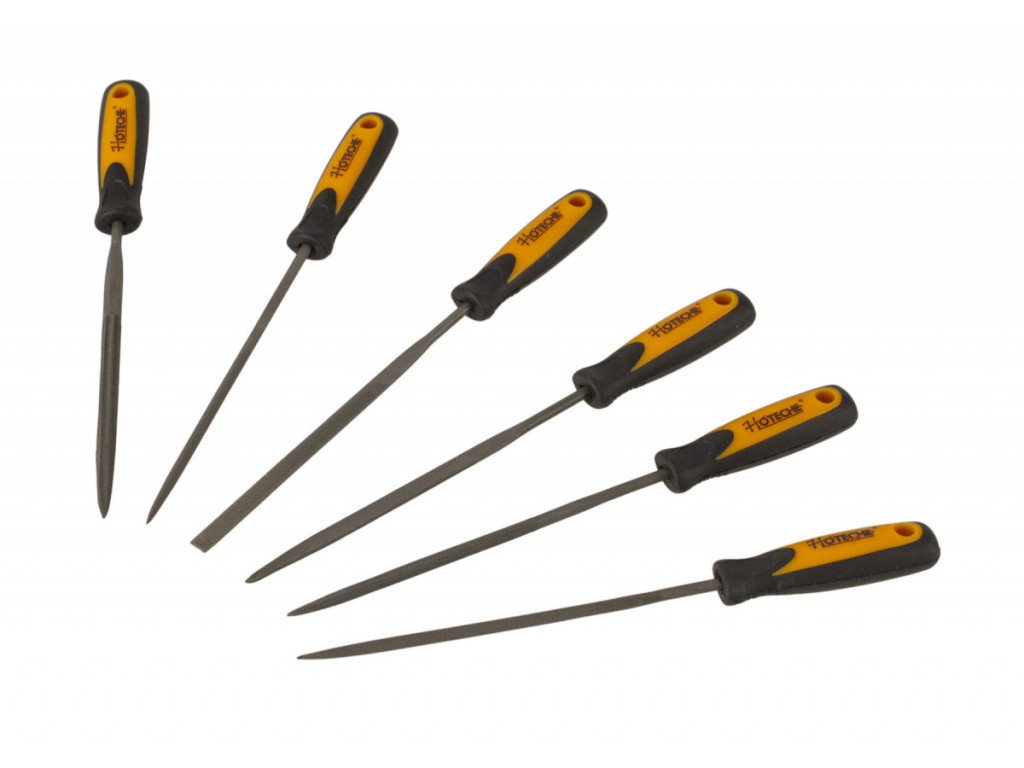 V sadě naleznete 6 ks jehlových pilníků o délce 155 mm zakončených ergonomickým pogumovaným madlem.